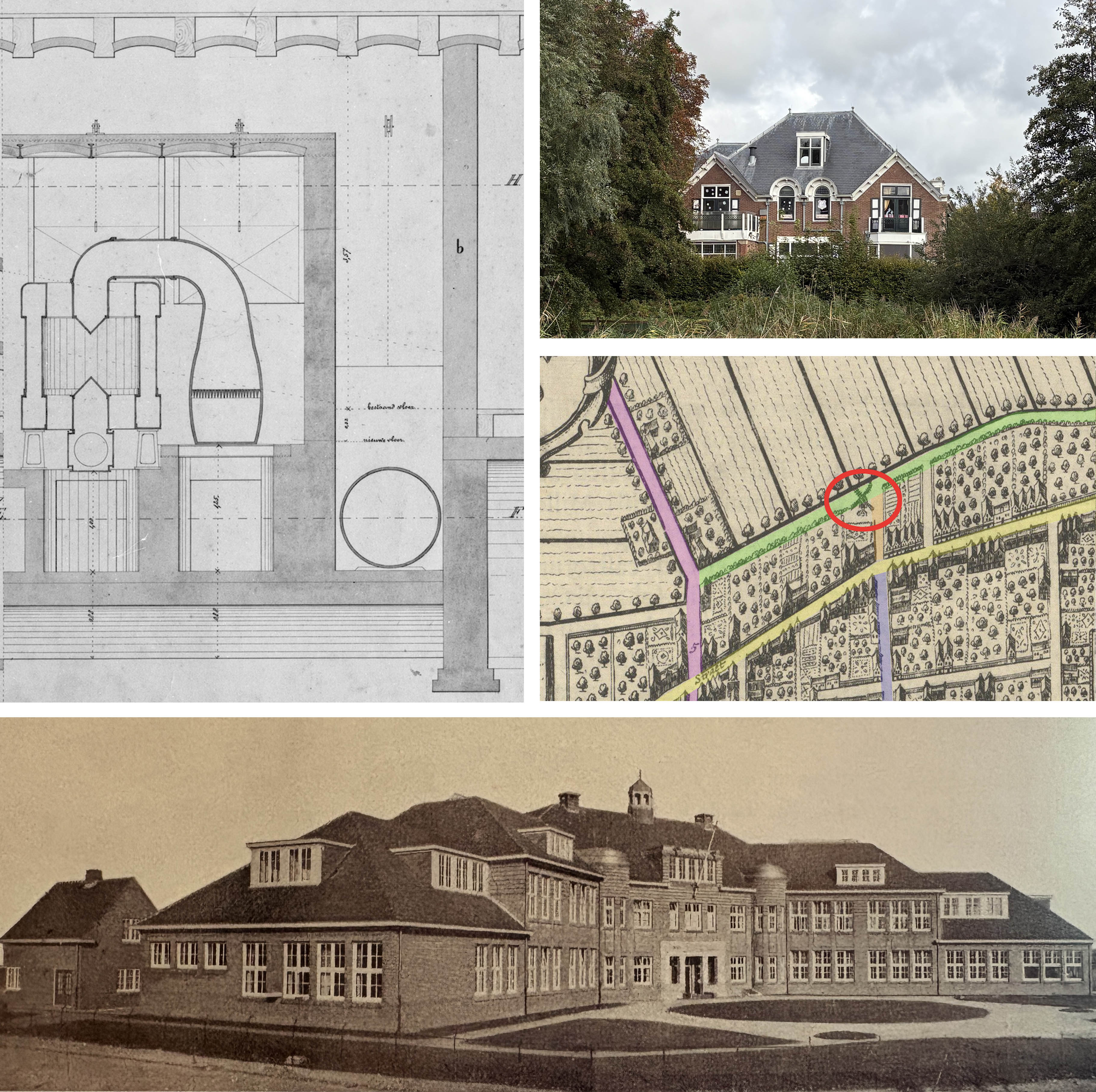 Linksboven de Rudolf Steinerkliniek, met ernaast het sociëteitsgebouw aan het Vrijthof. Onder de genieloods van Fort bij Velsen (foto's: Haags Gemeentearchief (linksboven) en Natasja Hogen)